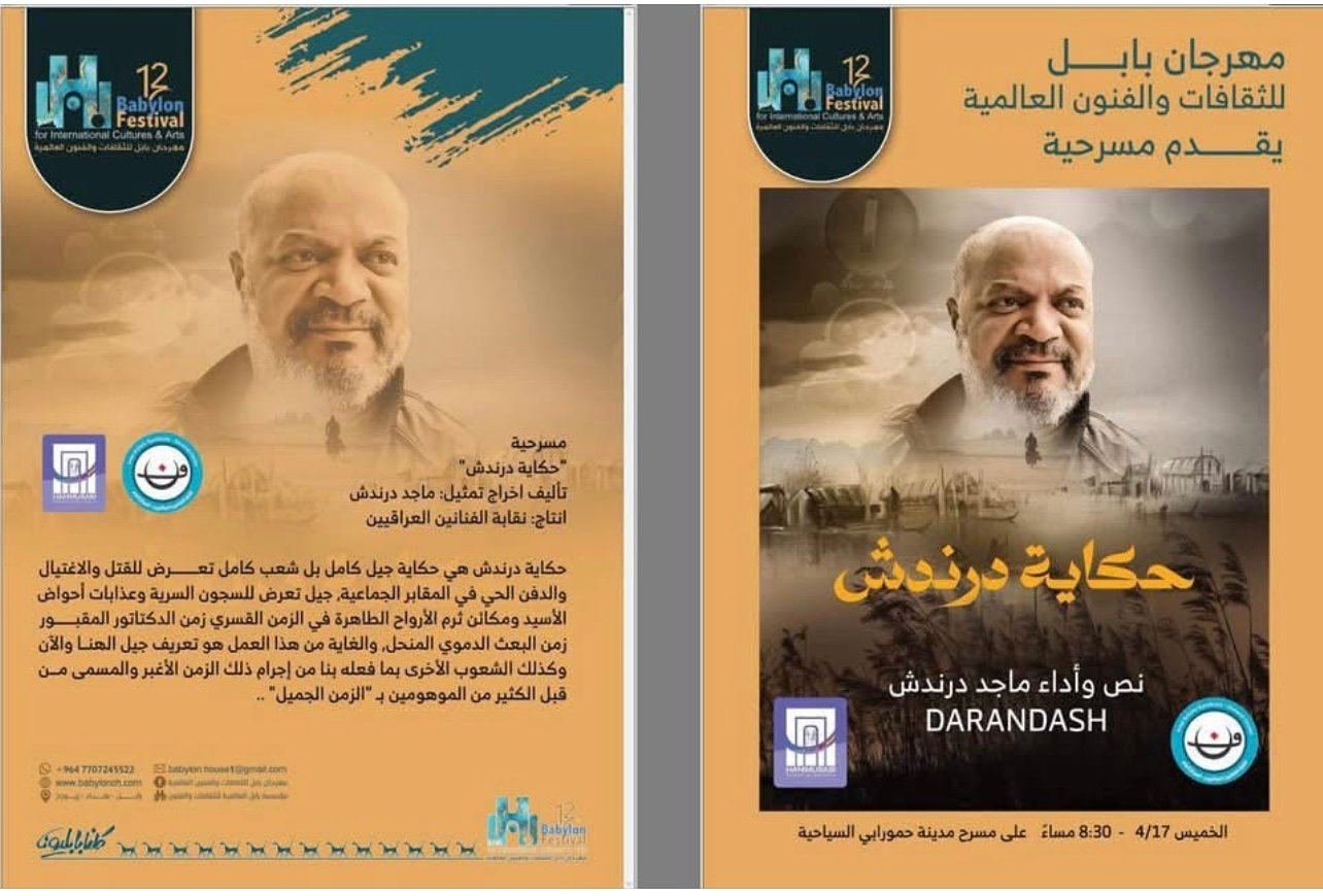يقدم الفنان ماجد درندش مسرحية بعنوان ” حكاية درندش” من انتاج نقابة الفنانين العراقيين ، تحكي المسرحية سيرة ذاتية للمؤلف، منذ بداية حياته في بغداد قبل الهجرة ومعانات جيله من نخبة المثقفينالعراقيين ومطاردة السلطة لهم ومن ثم الهجرة ومعاناته ، والعودة بعدها للوطن.